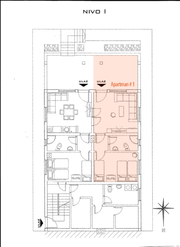Apartman 1 je prostrani četvorokrevetni apartman u suterenu, izuzetno dobro zvučno i termički izolovan. Opremljen parketom, udobnom ugaonom garniturom, velikom spavaćom sobom i prostranim kupatilom. Visoki plafoni ističu eleganciju i doprinose osećaju prostornosti i slobode. Velika, bezbedna, prednja terasa omogućava prijatne boravke na otvorenom sa najmlađima. Napomena: Nema kompletnu kuhinju. U paketu sa Apartmanom #2 izdaje se kao FULL DUPLEX za do 8 osoba.