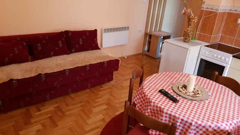Spavaća soba sa francuskim ležajem, dnevni boravak sa kaučem na rasklapanje, kuhinja komplet opremljena, kupatilo, terasa, klima i parking za automobil.